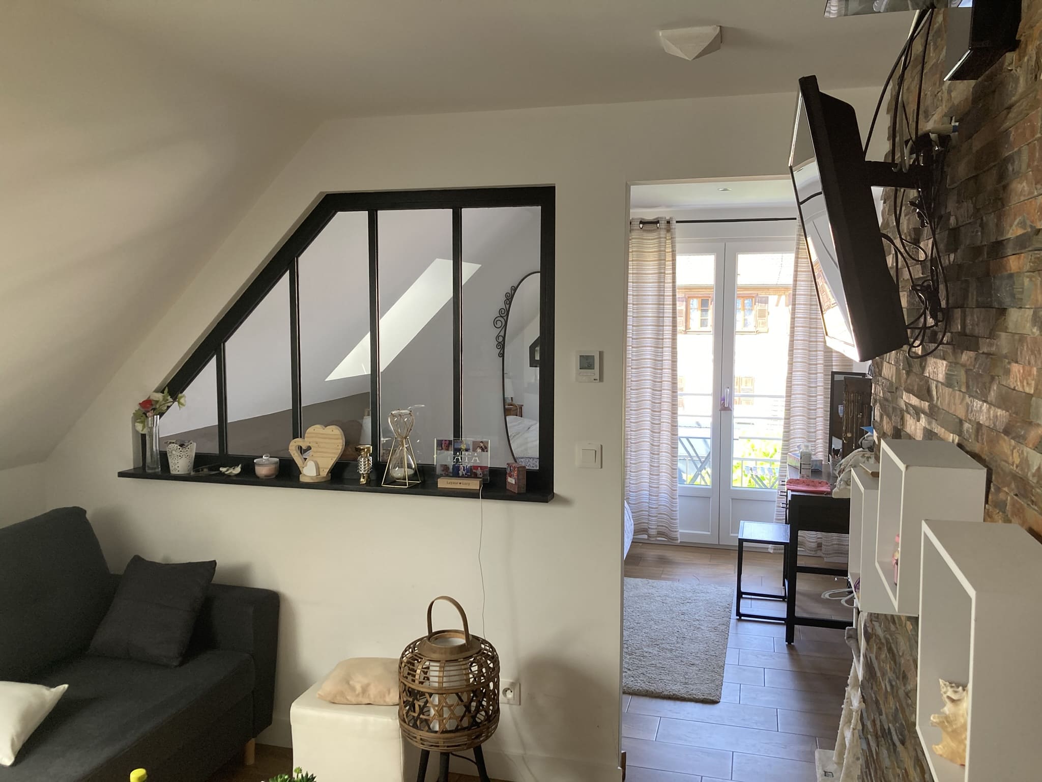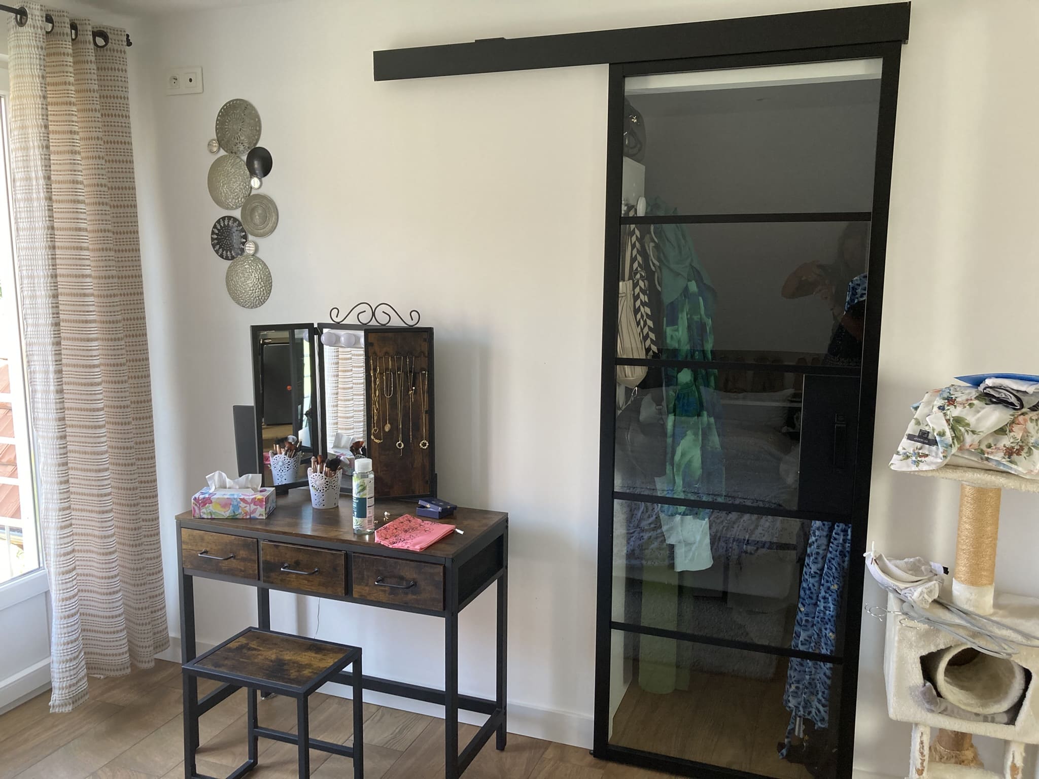 . 1 chambre avec un lit double (160 cm), un grand dressing et un accès direct à un balcon, avec vue sur la piscine et maisons alsaciennes.